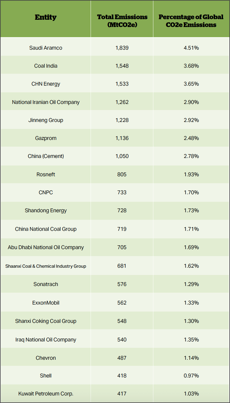 The top 20 companies based on their total emissions in 2023 can be found in the table below. For the entire list of all 169 entities, visit the 2023 update by Carbon Majors.